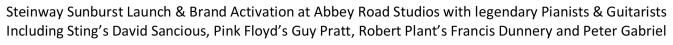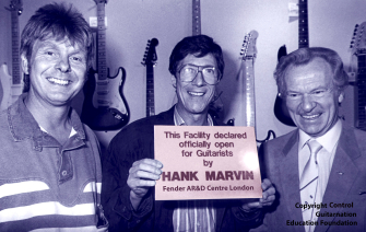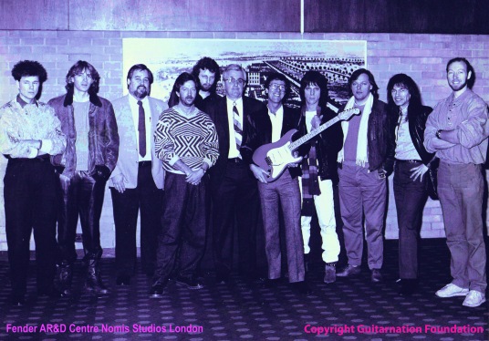 On the occasion of The Post-CBS Summit, the first Post-CBS Stratocaster produced in the new era is a recreation for Hank Marvin 27 years later of the first Stratocaster to be imported into the UK by EMI for Cliff Richard in 1959 for his iconic guitarist Hank B Marvin. Fender President Bill Schultz and Vice President Dan Smith flew into London with J. Hill, pictured between Clapton and Schultz, Director of Fender AR&D Centre near Jimmy Page's London home in Kensington at the time. With the Fender USA trio, a stellar pack of uniquely British Isles based artists, aka The Britpack, of luminary guitarists, who helped rebrand and relaunch Fender into a new golden era, are here with David Gilmour's Phil Taylor, Al Dutton with Jeff Beck. Alan Rogan with Pete Townshend and Keith Richards and Carter for Jimmy Page, and the advent of Fender Signatures and Iconic Series reproductions of legendary Fender Guitars.